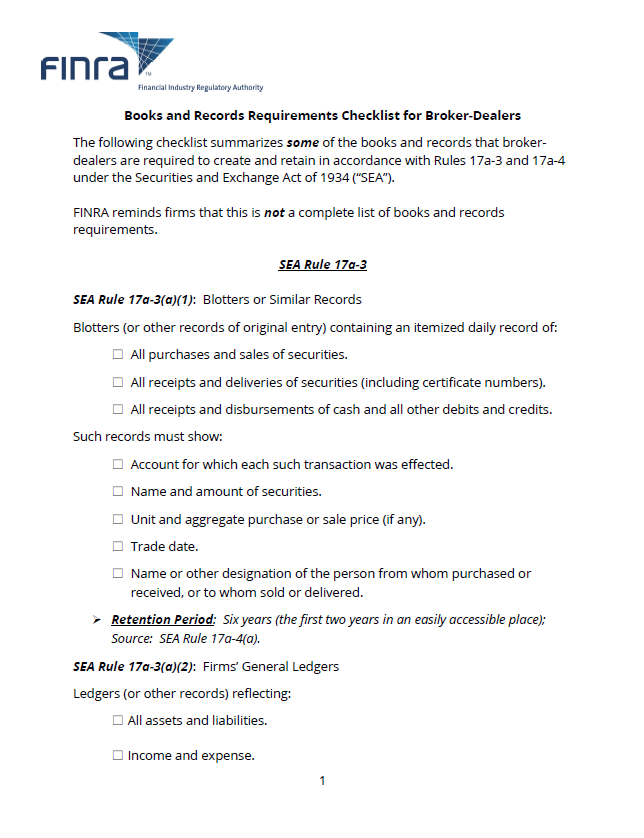 Section 17(a)(1) of the Securities Exchange Act of 1934 ("Exchange Act" or "SEA") requires registered broker-dealers to make, keep, furnish and disseminate records and reports prescribed by the Securities and Exchange Commission ("SEC"). FINRA’s Checklist summarizes some of the books and records that FINRA Member broker-dealers are required to create and retain in accordance with Rules 17a-3 and 17a-4 under the Securities and Exchange Act of 1934 (“SEA”). Members also downloaded the Broker-Dealer Books & Records File Management Directory.