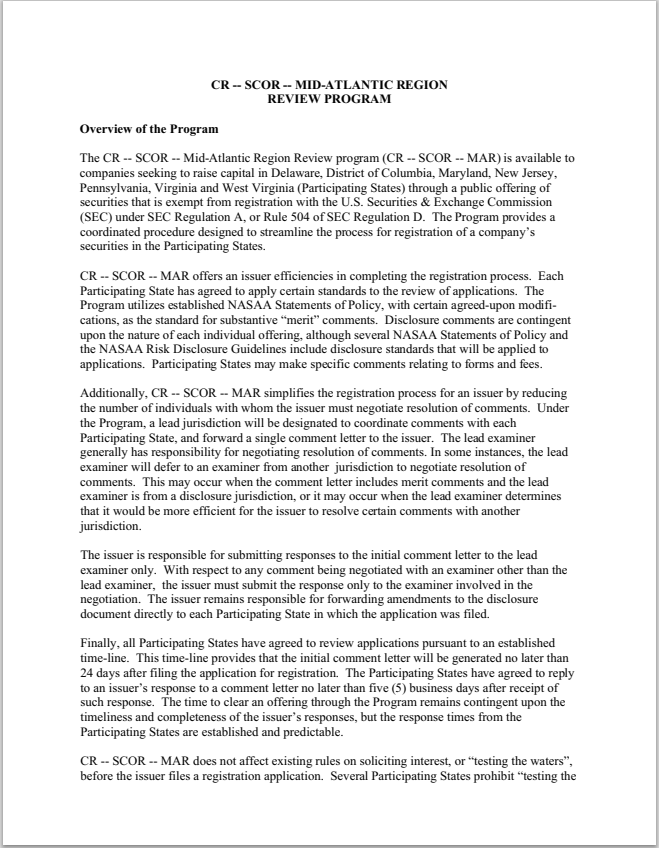 MD- Maryland Small Corporate Offering Registration Mid-Atlantic Region Program