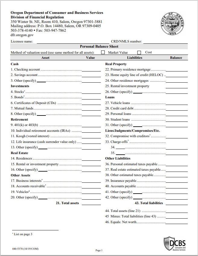 IA- Oregon Investment Adviser Rep. Personal Balance Sheet and Income Statement Form