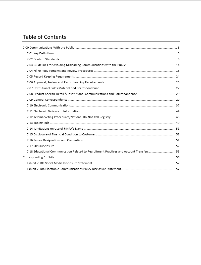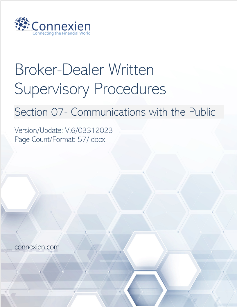The Broker-Dealer Written Supervisory Procedures Section on Communications with the Public serves as an important part of a firm’s written supervisory procedures (WSPs) and overall compliance program in accordance with FINRA Rule 3110. The WSP Section helps firms outline and implement effective supervisory processes regarding a firm’s communications requirements. The customizable WSP Section allows firms to memorialize their compliance and supervisory processes and includes eighteen (18) separate sections and exhibit list that help firms outline effective supervisory processes that can be further customized to align with their specific business model. Members also viewed our WSP Library.
