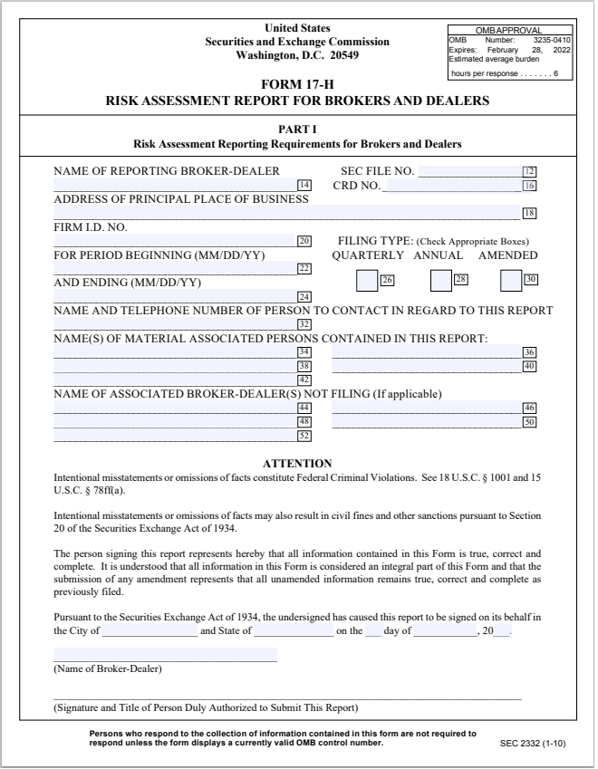 Form 17-H is the Risk Assessment Report for Broker-Dealers that must be filed with the Securities and Exchange Commission (SEC) by all securities brokers. Broker-dealers are required to disclose the activities of affiliated entities including: Parent company, holding company or any subsidiary that could impact the operating and financial dealings of the broker-dealer. Members also downloaded 2020 State Requirements for Broker-Dealer Annual Audited Financial Statements or SEC Form BD or SEC Form Custody.