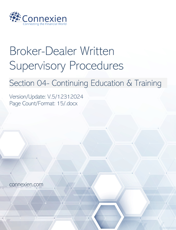 The updated Broker-Dealer Written Supervisory Procedures Section on Continuing Education & Training serves as an important part of a firm’s written supervisory procedures (WSPs) and overall compliance program in accordance with FINRA Rule 3110. The WSP Section helps firms outline and implement effective supervisory processes regarding a firm’s continuing education program. The customizable WSP Section allows firms to memorialize their compliance and supervisory processes and includes four (4) separate sections and exhibit list that help firms outline effective supervisory processes that can be further customized to align with their specific business model. Members also viewed our WSP Library.