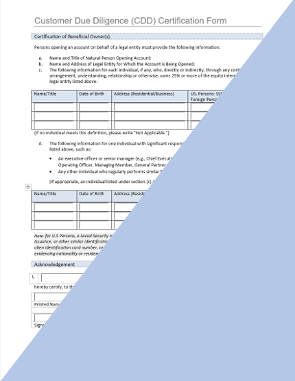 The updated FinCEN Customer Due Diligence (CDD) Certification Form is intended to meet the certification requirements of the new FinCEN Customer Due Diligence (CDD) Rule that applies to all new accounts opened on or after May 11, 2018. The new CDD Rule outlines explicit customer due diligence requirements and imposes a new requirement for financial institutions to identify and verify the identity of beneficial owners of legal entity customers, subject to certain exclusions and exemptions.