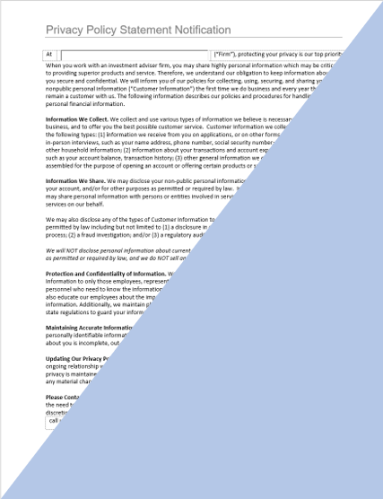 The Investment Adviser Privacy Policy Statement serves as an important part of an investment adviser’s program for implementing notice requirements and restrictions on its ability to disclose nonpublic personal information about consumers in accordance with Regulation S-P. The SEC adopted Regulation S-P privacy rules under section 504 of the Gramm-Leach-Bliley Act (Act). Under the Act, a financial institution must provide its customers with a notice of its privacy policies and practices and must not disclose nonpublic personal information about a consumer to nonaffiliated third parties unless the institution provides certain information to the consumer and the consumer has not elected to opt out of the disclosure. Members also viewed Broker-Dealer Privacy Policy Statement Notification.