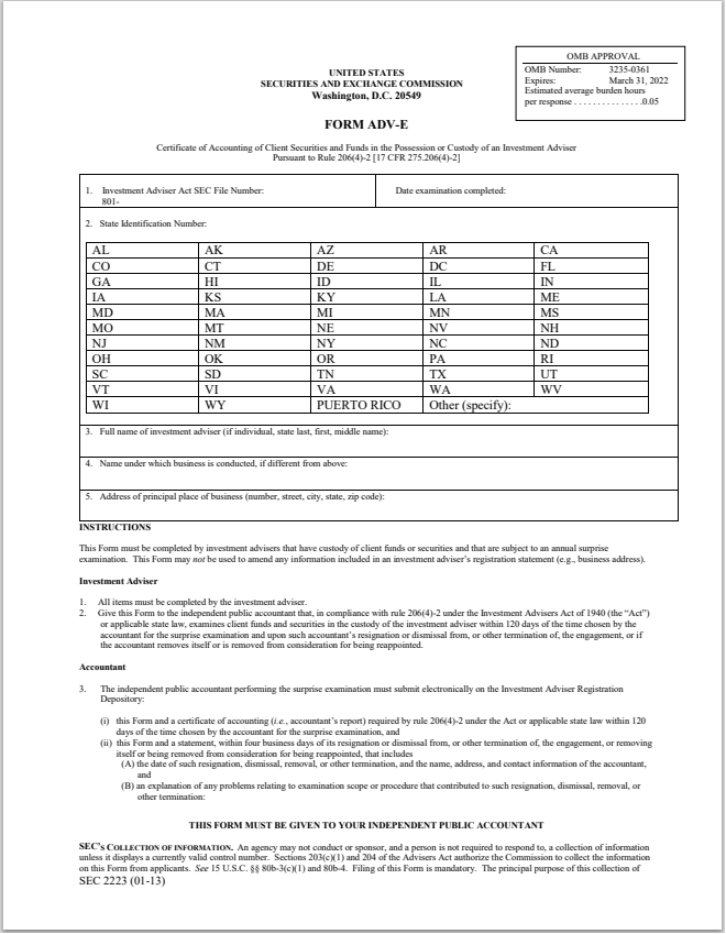 Form ADV-E is primarily utilized and evaluated by accountants ensuring the proper handling of client assets by the registered investment adviser. Information included on Form ADV-E includes: The investment adviser’s personal information, state of practice and a certification of client assets. Members also downloaded New Form ADV Part 1A Amendment Update Form or Form ADV Offer Letter & Summary of Material Changes or SEC Form ADV Parts 1 & 2 General Instructions or Investment Adviser Registration Questionnaire.