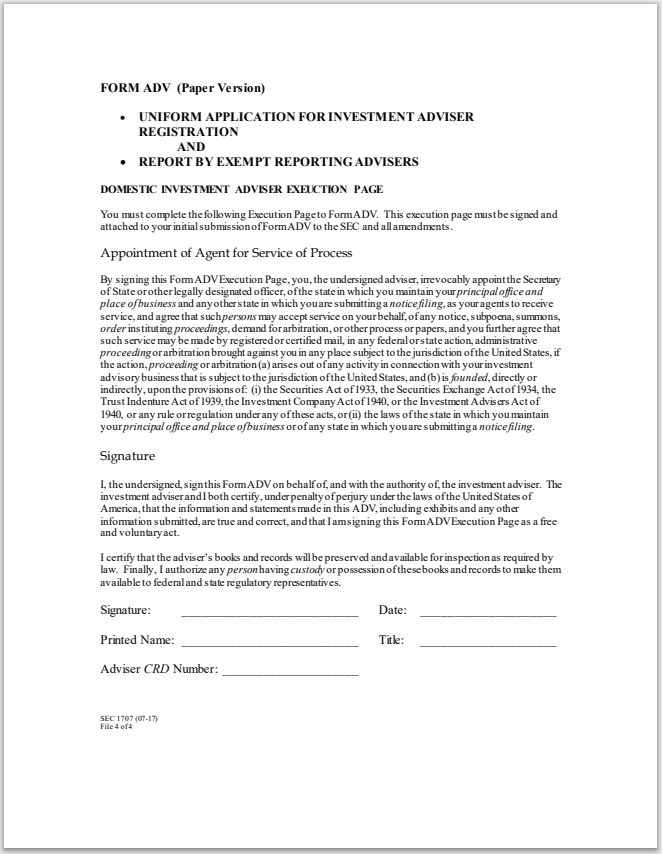 The Form ADV (Uniform Application for Investment Adviser Registration and Report by Exempt Reporting Adviser) Execution Page must be completed during the initial application submission and whenever amending Form ADV. There are three unique execution pages at the end of Form ADV and depending on the specific circumstances the appropriate execution page must be executed. Members also downloaded SEC Form ADV Parts 1 & 2 General Instructions or SEC Form ADV Part 1A & Part 1B or SEC Form ADV Part 2.