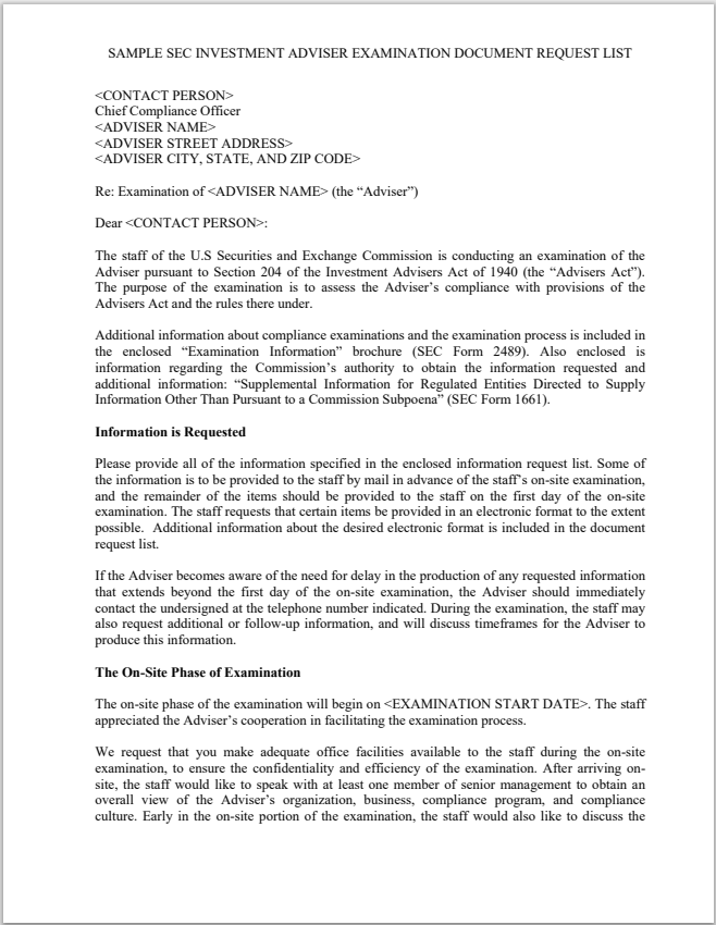 The SEC Investment Adviser Sample Exam Records Request List outlines some of the documentation that might be requested during a Securities and Exchange Commission examination. Investment advisers should prepare the documentation prior to and upon request by the Securities and Exchange Commission. Members also downloaded SEC Form ADV Parts 1 & 2 General Instructions or ADV Execution Page.