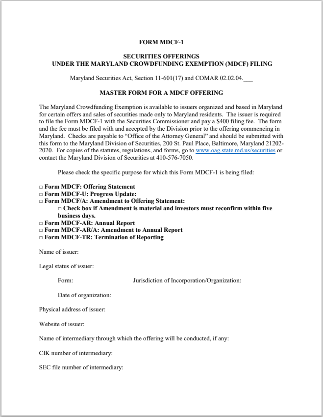 The MD Crowdfunding Exemption Form MDCF-1 and Appendix 1 should be reviewed and completed by issuers organized and based in Maryland for certain offers and sales made available only to Maryland residents pursuant to Maryland Securities Act, Section 11-601(17) and Code of Maryland Regulations Chapter 02.02.04. Members also downloaded Maryland Crowdfunding Offering Statement Optional Question and Answer Format Form MDCF-2.