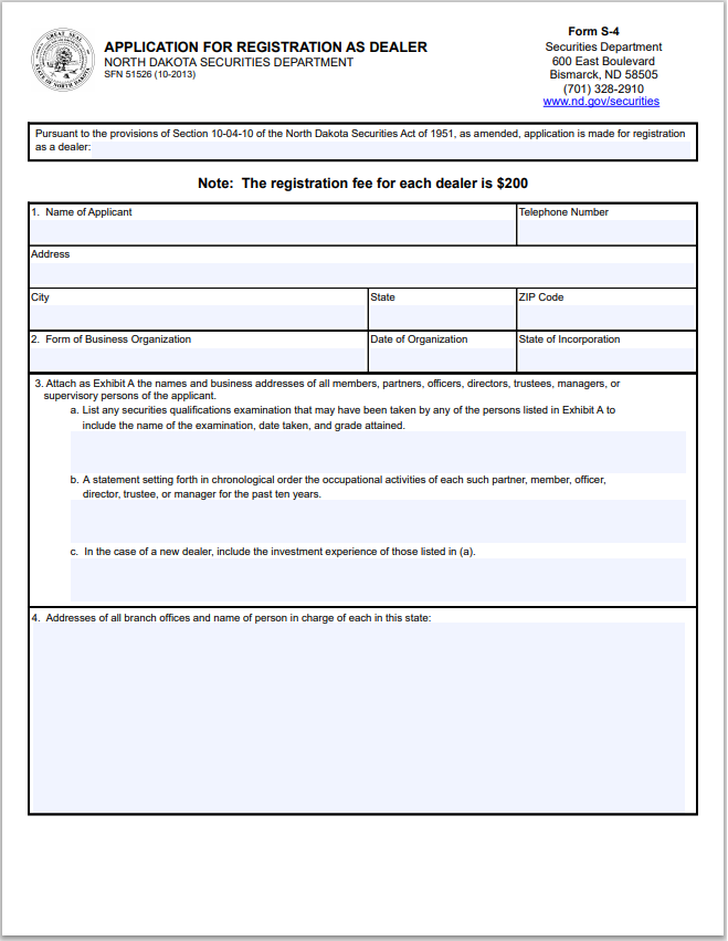 The ND Dealer Registration Application Form S-4 should be completed and filed by security dealers seeking registration pursuant to the North Dakota Securities Act of 1951, Section 10-04-10. Members also downloaded North Dakota Issuer-Dealer Renewal or Termination Form S-6.