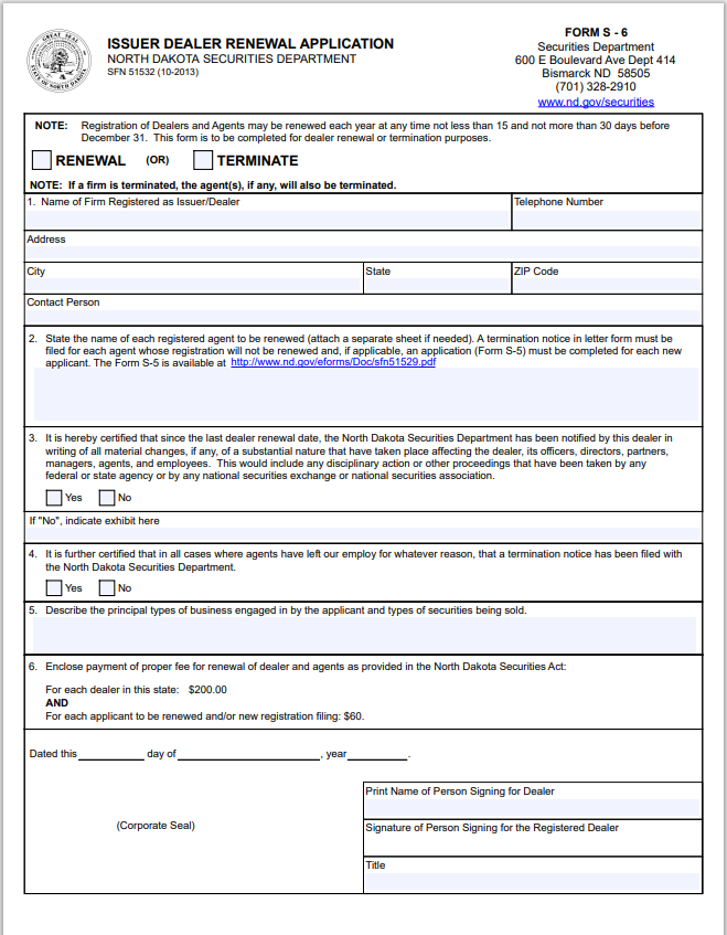 The ND Issuer-Dealer Renewal or Termination Form S-6 should be completed and filed by dealers and agents renewing their registration each year at any time not less than 15 and not more than 30 days before December 31. Form S-6 can be used to terminate registration as well. Members also downloaded North Dakota Dealer Registration Application Form S-4.