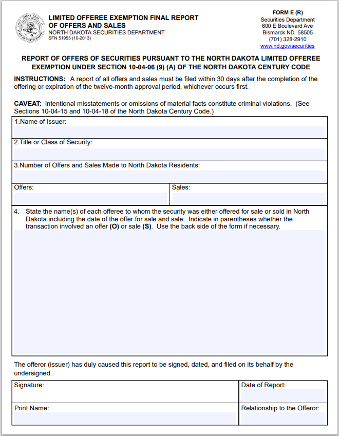 The ND Limited Offeree Exemption Final Report of Offers and Sales Form-(E)R should be filed within 30 days after the completion of the securities offering or at the expiration of the 12 month approval period, whichever occurs first pursuant to North Dakota Century Code, Section 10-04-06 (9)(A). Members also downloaded North Dakota Limited Offeree Exemption Application Form-E.