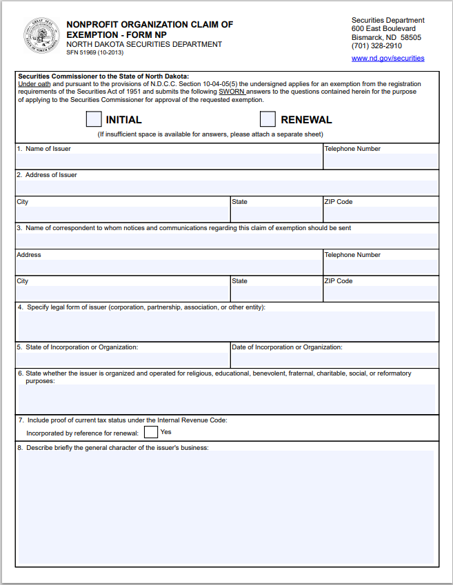 The ND Nonprofit Organization Claim of Exemption Form-NP should be filed by nonprofit organization issuers seeking an exemption from the registration requirements of the North Dakota Securities Act of 1951 pursuant to the North Dakota Century Code Section 10-04-05(5).