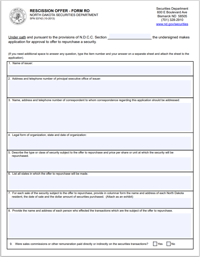 The ND Securities Rescission Offer Form-RO should be completed and filed by companies seeking approval to offer to repurchase a security pursuant to North Dakota Century Code regulations.