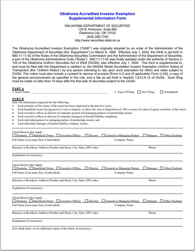 The OK Accredited Investor Exemption Form is a representation that the issuer of the sale of securities ensures that the sale will be made available to only accredited investors pursuant to the Oklahoma Uniform Securities Act. The Accredited Investor Exemption Form must be accompanied by the Model Accredited Investor Exemption Uniform Notice of Transaction Form and the Uniform Consent to Service of Process Form U-2. Filings should be made no later than 15 days after the first sale of securities subject to the Oklahoma Uniform Securities Act. Members also downloaded Oklahoma Uniform Consent to Service of Process Form U-2 or Oklahoma Model Accredited Investor Exemption Uniform Notice of Transaction Form.