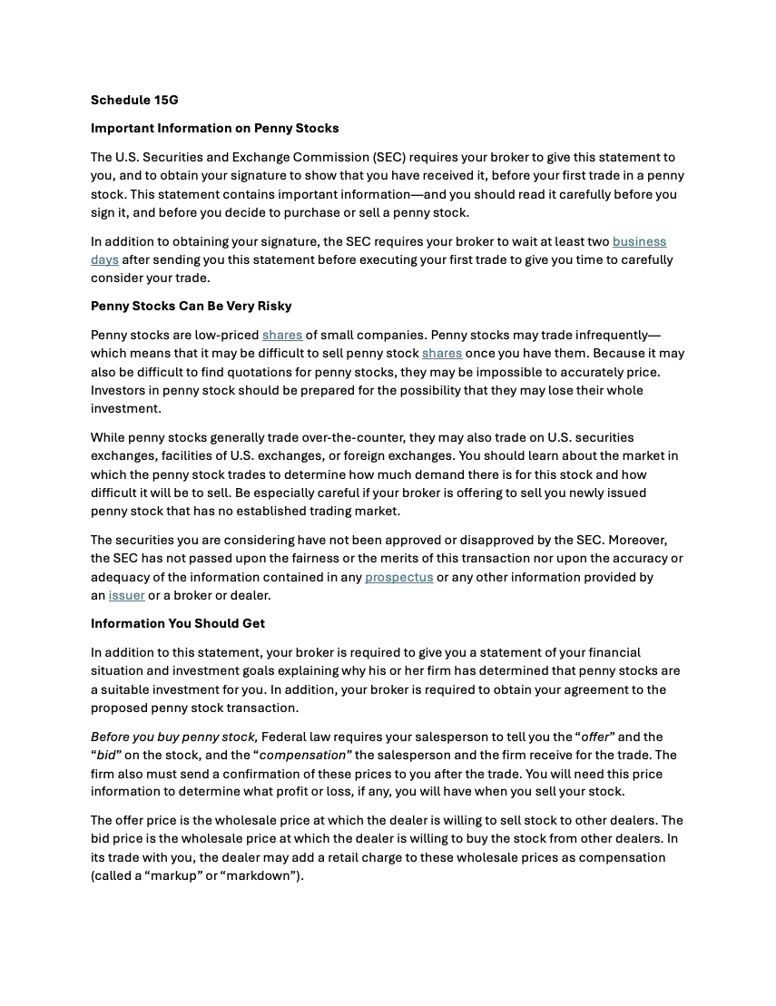 The SEC Sample Schedule 15G serves as an important disclosure document that broker-dealers are required to furnish to customers prior to engaging in transactions in penny stocks in accordance with SEC Rule 15g-2 of the Penny Stock Disclosure Rules adopted pursuant to the Securities Enforcement Remedies and Penny Stock Reform Act of 1990. Members also viewed WSP Section 19- Low Priced Securities (Penny Stocks), and our entire WSP Library.